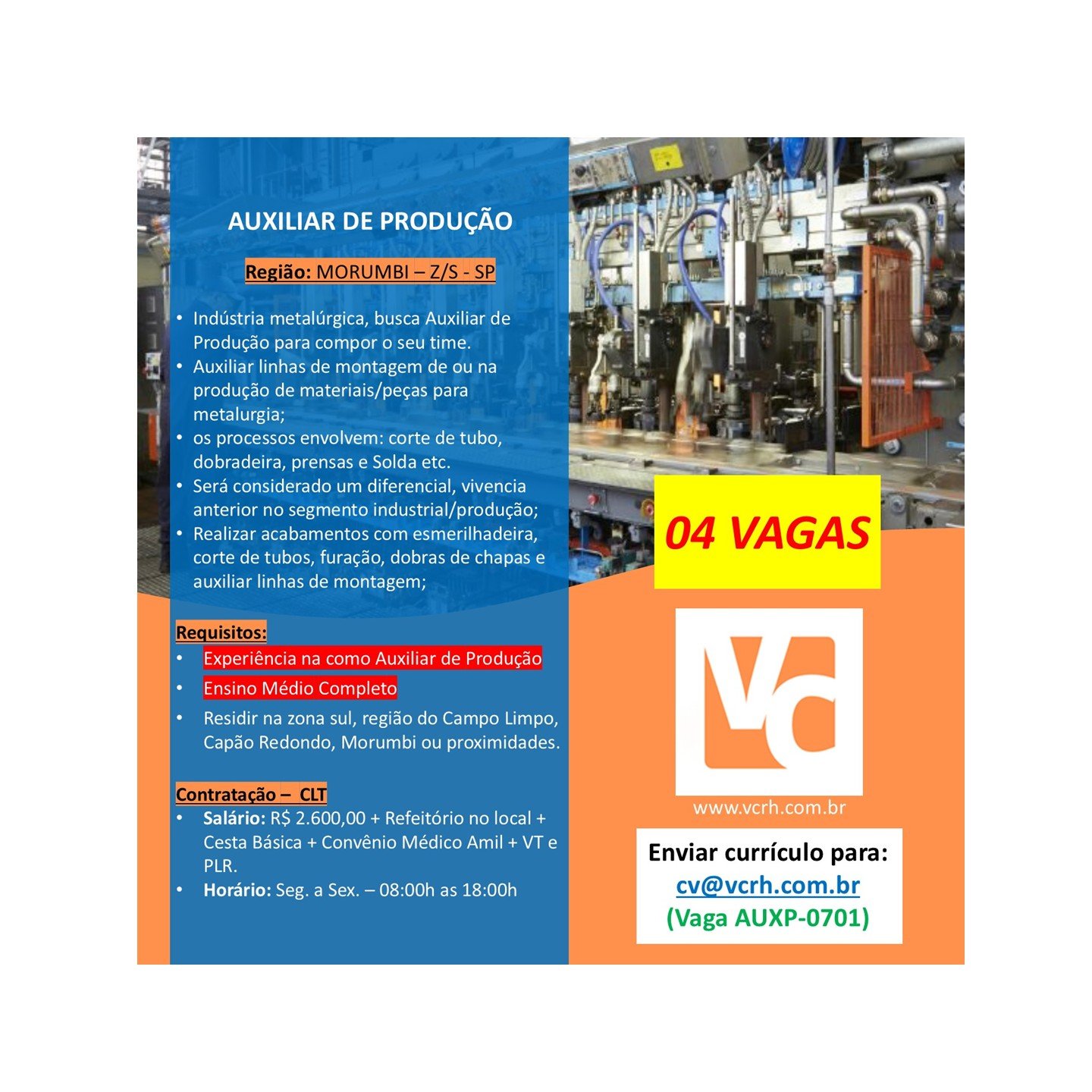Região: MORUMBI – Z/S – SP Indústria metalúrgica, busca Auxiliar de Produção para compor o seu time. Auxiliar linhas de